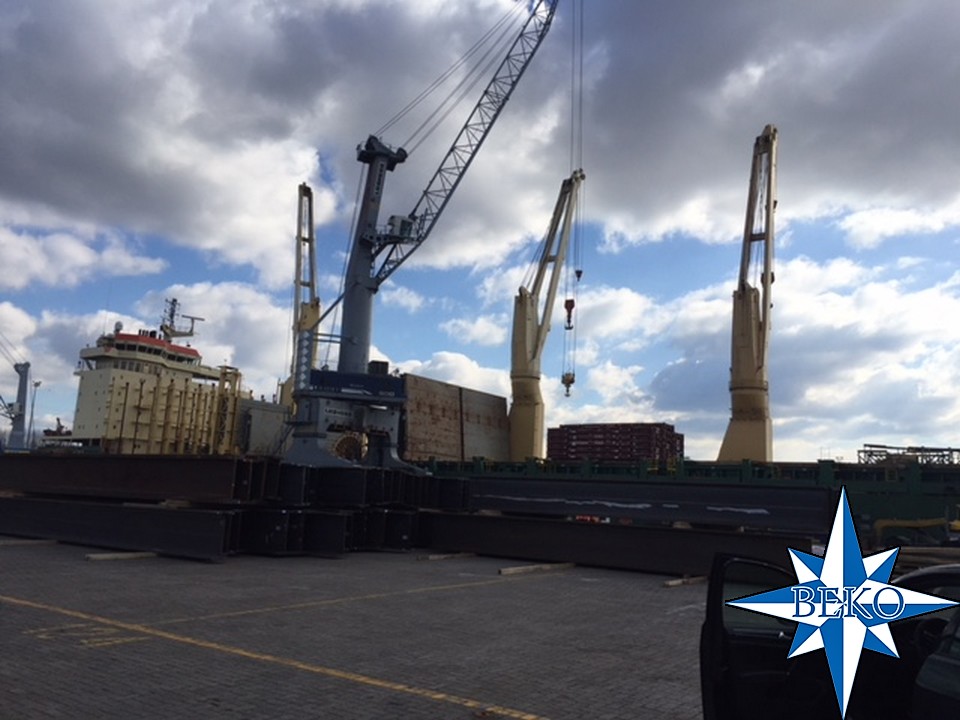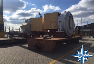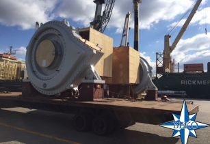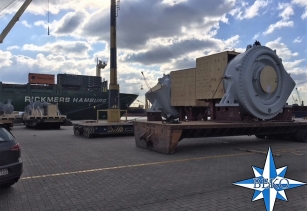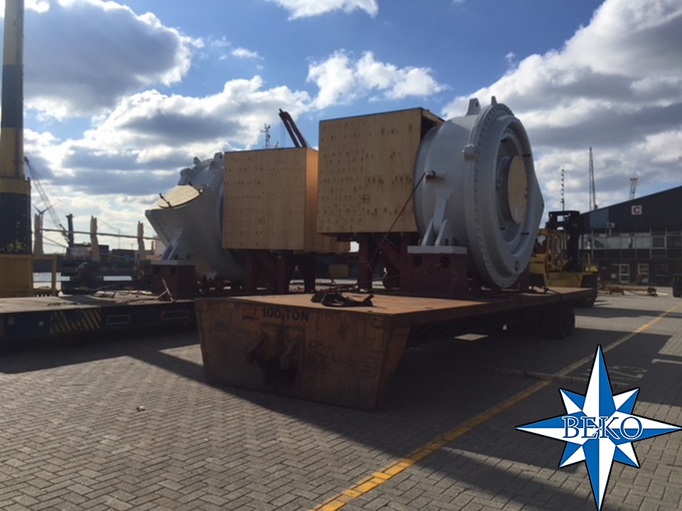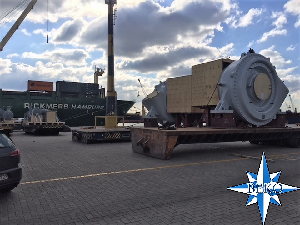 2 x baggerpompen wegend 63 ton elk klaar om aan boord MV Rickmers Hamburg geladen te worden met bestemming Shanghai