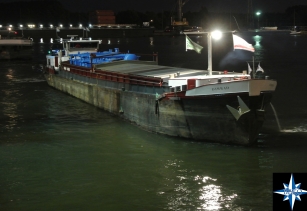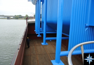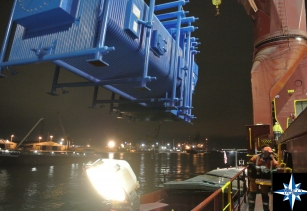Mobiele kraan en riggers om lading in binnenschip te laden, binnenschip voor transport naar Antwerpen en in Antwerpen het laden in het zeeschip verzorgt.