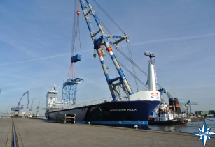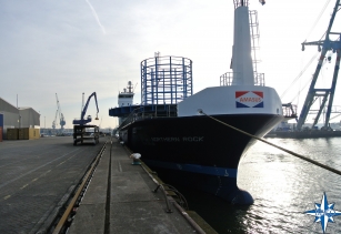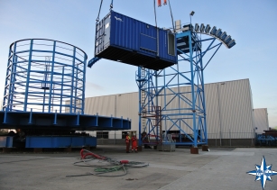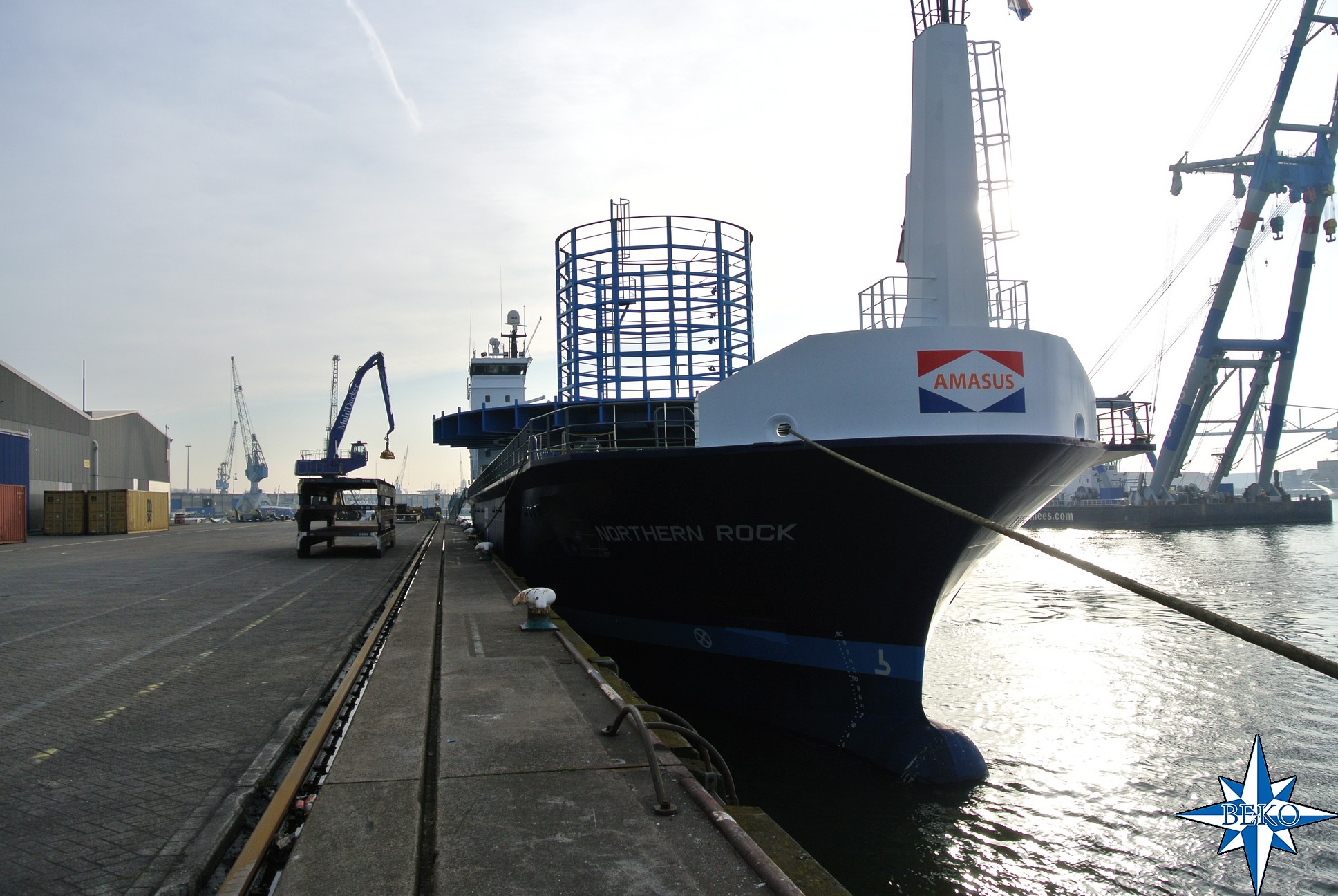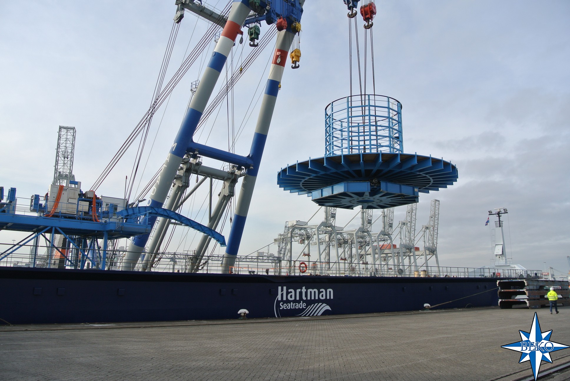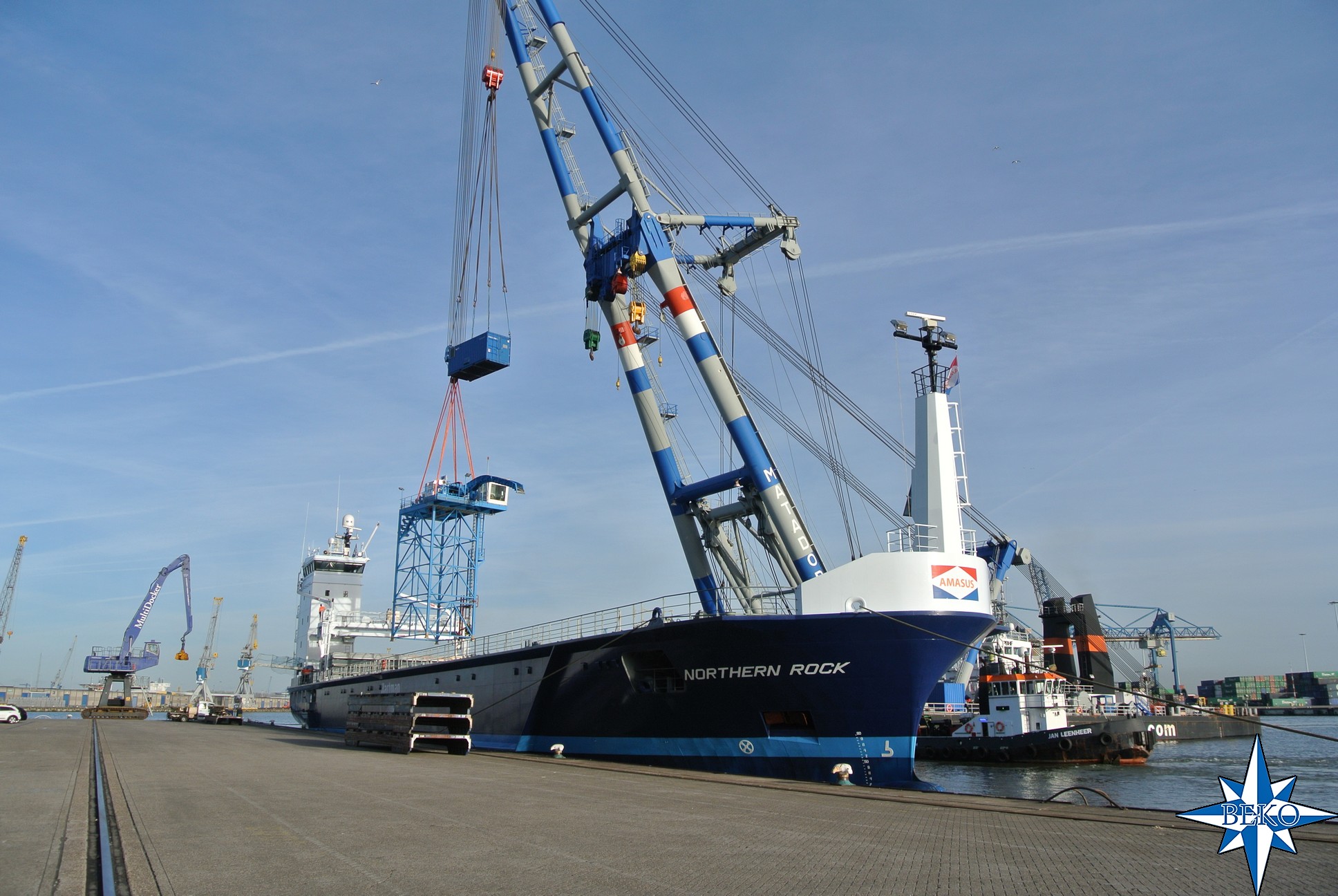 De lading kwam samen met nog een toren van 14 meter uit Zweden aan per MV Northern Rock en we hebben de Matador 3 ( drijvende bok) gebruikt om het geheel op de fundatie te zetten.