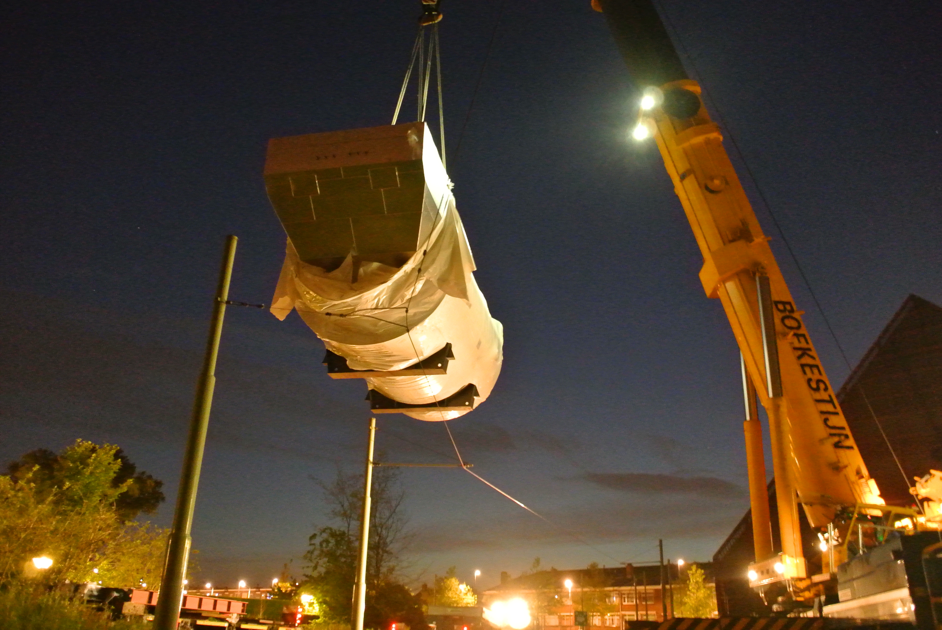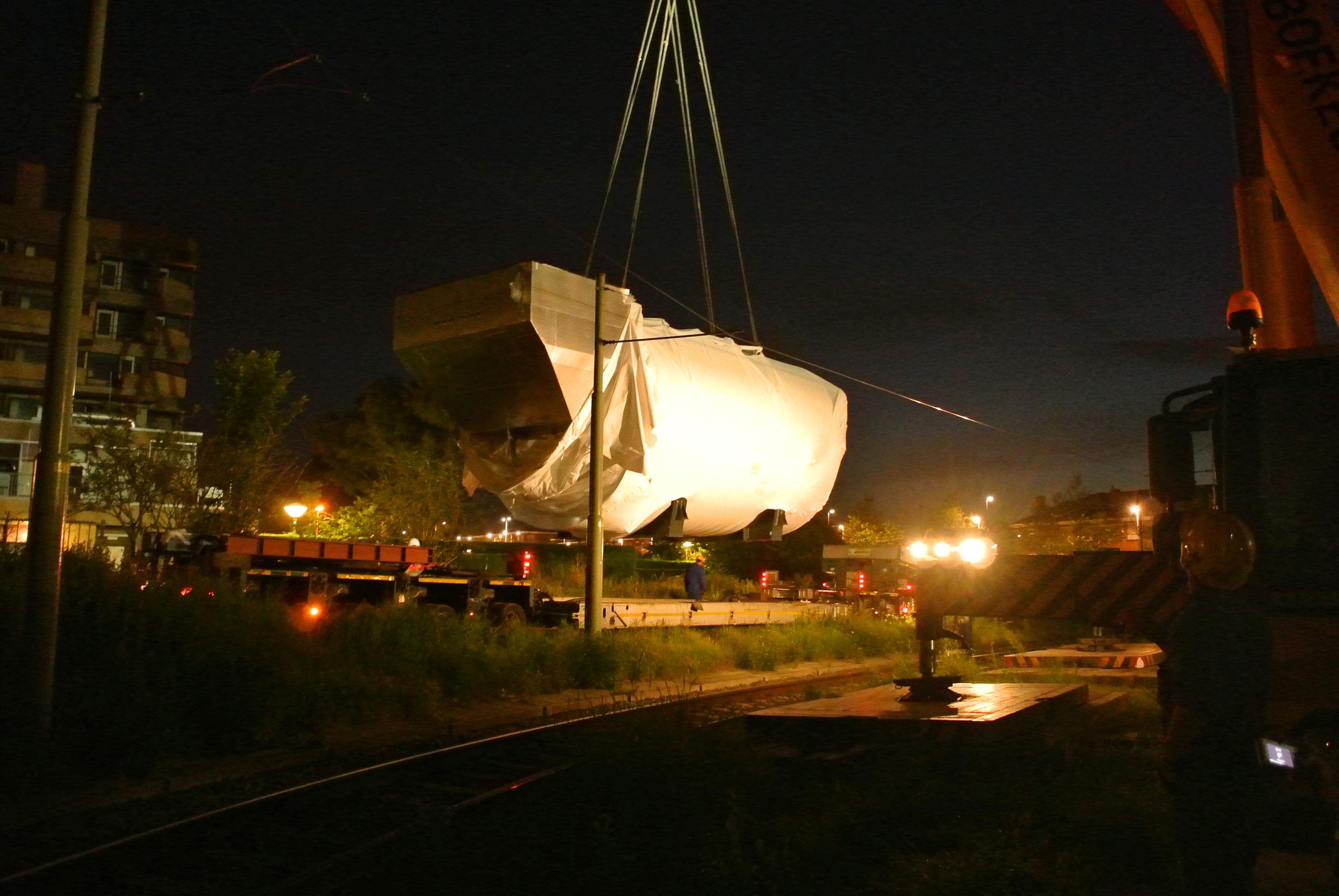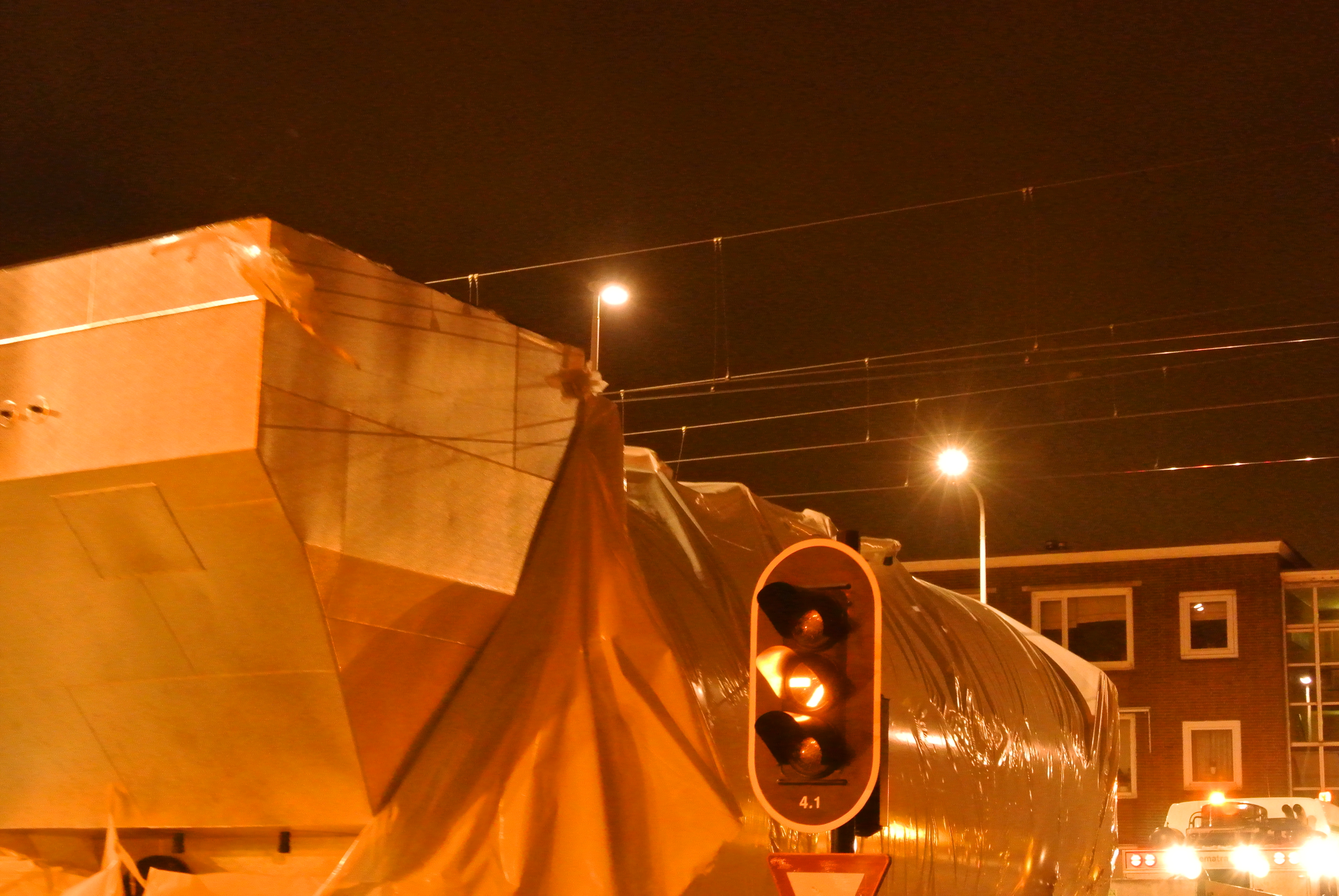 Het transport door Den Haag moest 's-nachts plaatsvinden deels onder en over de bovenleidingen van de HTM.